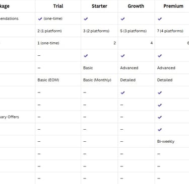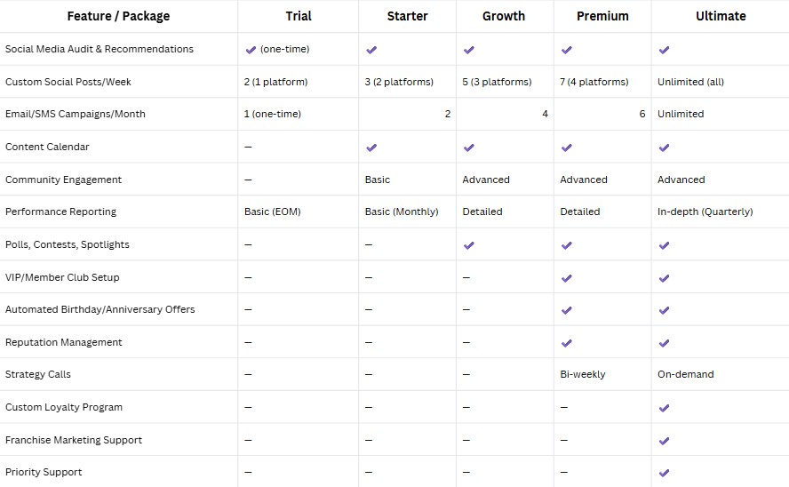 My social media packages meet you right where you are, whether you're just getting a taste of digital marketing or already cooking up serious online growth. Start with the Trial Package for low-commitment, quick insights into what makes your audience bite. Move up to the Starter Package for a steady social presence, consistent engagement, and simple repeat-visit campaigns that build recognition. When you're ready to turn followers into regulars, the Growth Package steps in with daily engagement, advanced community-building, and detailed reporting that turns data into action. For brands ready to scale, the Premium Package offers full-platform management, exclusive loyalty features, and proactive reputation monitoring—so you're always one step ahead. And if you're leading a multi-branch or franchise operation, the Ultimate Business Package gives you unlimited content, a fully customized loyalty program, and elite analytics and consulting to help your brand dominate both online and offline. Each package is crafted to help food entrepreneurs like you attract, engage, and keep customers coming back for seconds—because your food deserves more than just likes; it deserves loyalty.